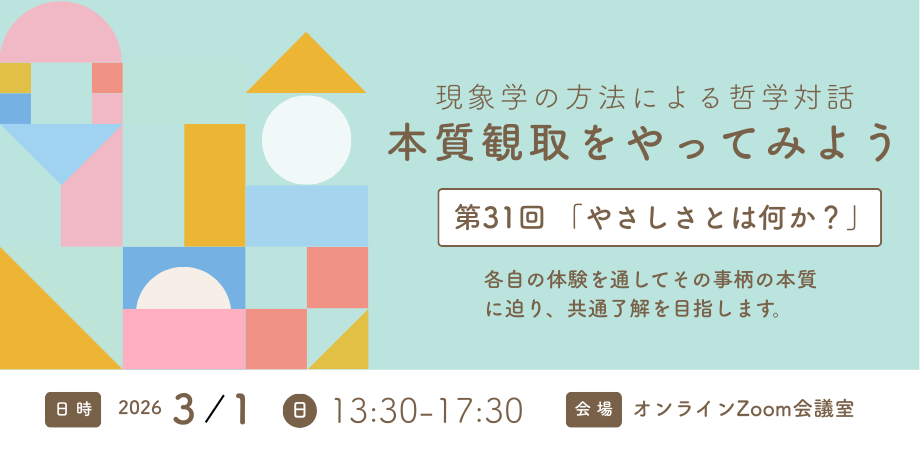 3/1(日)開催 現象学の方法による哲学対話「本質観取」をやってみよう(テーマ:やさしさとは何か?)