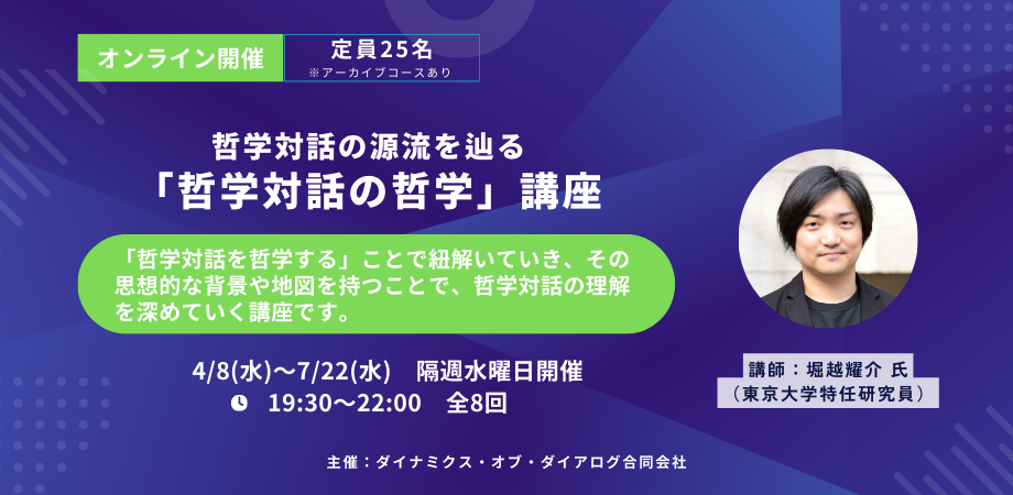 | 開催日時 | 日時:各回 19:30~22:00 全8回 ①4月8日(水)ムーブメントとしての哲学対話 ②4月22日(水)「探究の共同体」の哲学 ③5月13日(水)「ソクラティク・ダイアログ」の哲学 ④5月27日(水)他者性・応答可能性の哲学 ⑤6月10日(水)ケア・知的安全性・コンテキストの哲学 ⑥6月24日(水)進行役を哲学する ⑦7月8日(水)公共性・市民性の哲学 ⑧7月22日(水)哲学対話の実践+質疑応答 |